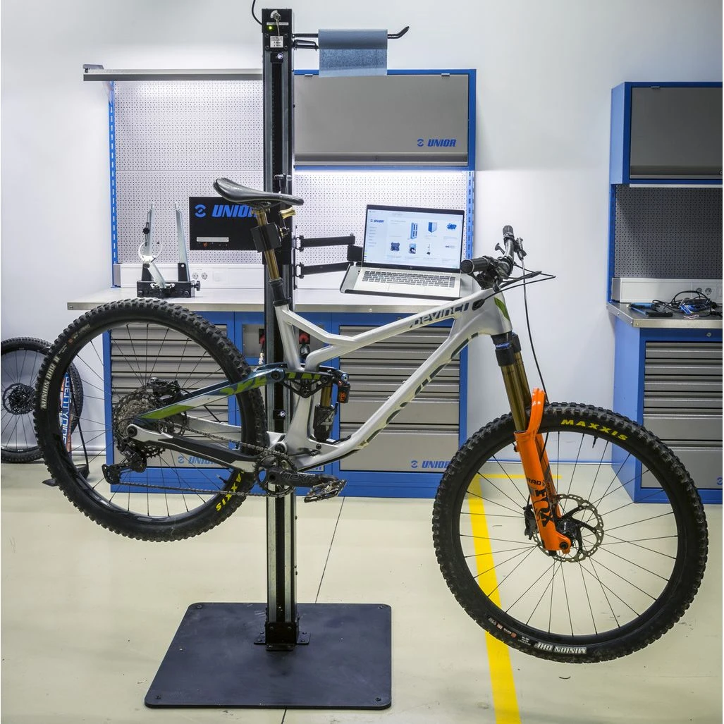 Der ausklappbare Laptopträger wird an der Säule des elektrischen Montageständers von Unior befestigt. Auf ihm sind Laptops optimal untergebracht. Diese Anordnung macht das Arbeiten komfortabler und produktiver, da der Computer genau dort ist, wo er benötigt wird. Der Zugriff erfolgt ohne jede gesonderte Bewegung hin zur Werkbank. Der Träger reicht der Größe nach für Laptops bis zu 15 Zoll aus, er ist um 90 Grad nach rechts und links schwenkbar. Der Arm ist auf 500 mm ausziehbar, so kann der Laptop unmittelbar bis zum Fahrrad hin gezogen werden und im Gegenzug bei Nichtgebrauch vollständig aus dem Arbeitsbereich entfernt werden.